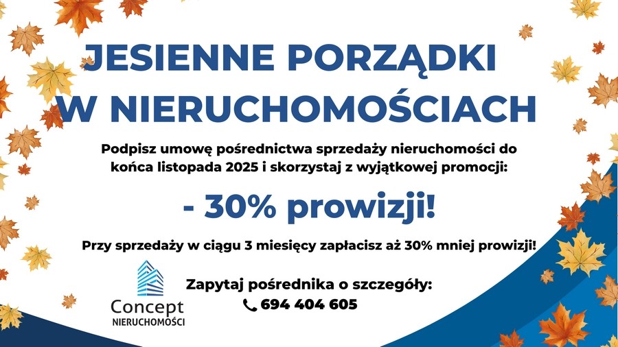 Podpisując w Biurze Nieruchomości Concept umowę pośrednictwa sprzedaży nieruchomości w październiku i listopadzie 2025 roku, zyskujesz nie tylko wsparcie doświadczonych pośredników, ale również gwarancję atrakcyjnych warunków finansowych. Jeżeli Twoja nieruchomość zostanie sprzedana w ciągu pierwszych trzech miesięcy współpracy, prowizja naszego biura zostanie obniżona aż o 30%. Ta oferta sprawia, że współpraca z nami staje się jeszcze bardziej opłacalna!