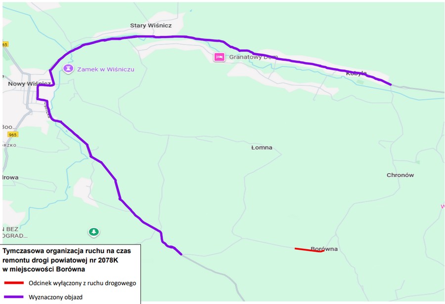 Objazd zamkniętego odcinka został wyznaczony drogami powiatowymi i oznaczony kolorem fioletowym na załączonej mapie.