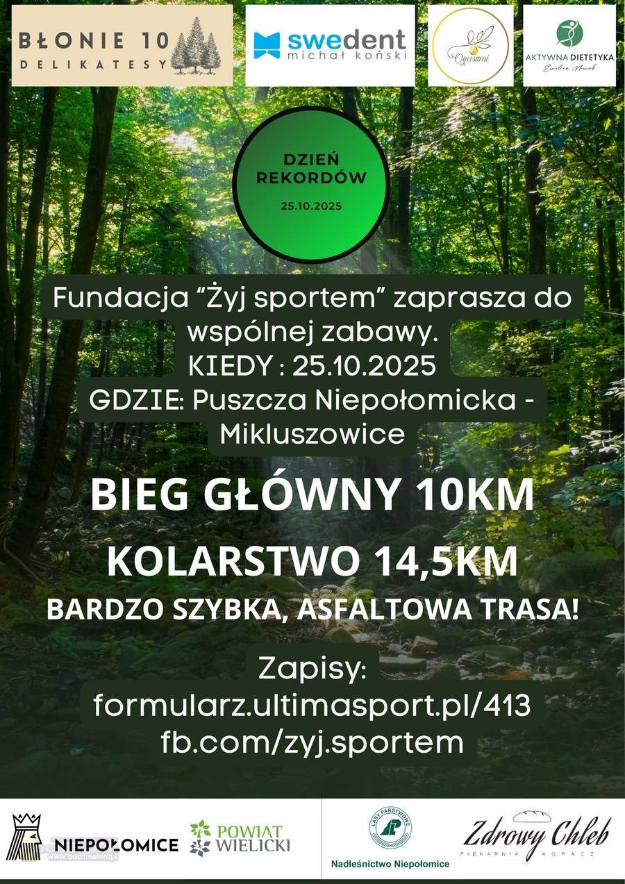 Fundacja Żyj Sportem zaprasza wszystkich miłośników aktywności fizycznej do udziału w wyjątkowym wydarzeniu sportowym, które odbędzie się 25 października 2025 roku w malowniczej scenerii Puszczy Niepołomickiej. W ramach imprezy pod nazwą „Dzień Rekordów” rozegrane zostaną zawody biegowe oraz kolarskie, skierowane zarówno do amatorów, jak i pasjonatów sportu.