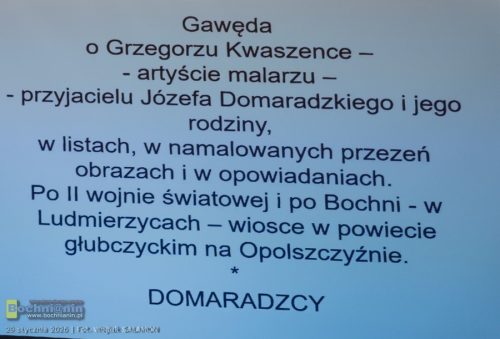 W czwartek w Muzeum im. Stanisława Fischera w Bochni odbyło się pierwsze w tym roku Czwartkowe Spotkanie Muzealne. Inauguracyjną prelekcję w ramach 44. edycji cyklu poprowadził mgr inż. Jerzy Okrzesa, który zaprosił publiczność na gawędę poświęconą malarzowi Grzegorzowi Kwaszence – artyście i przyjacielowi rodziny Domaradzkich.