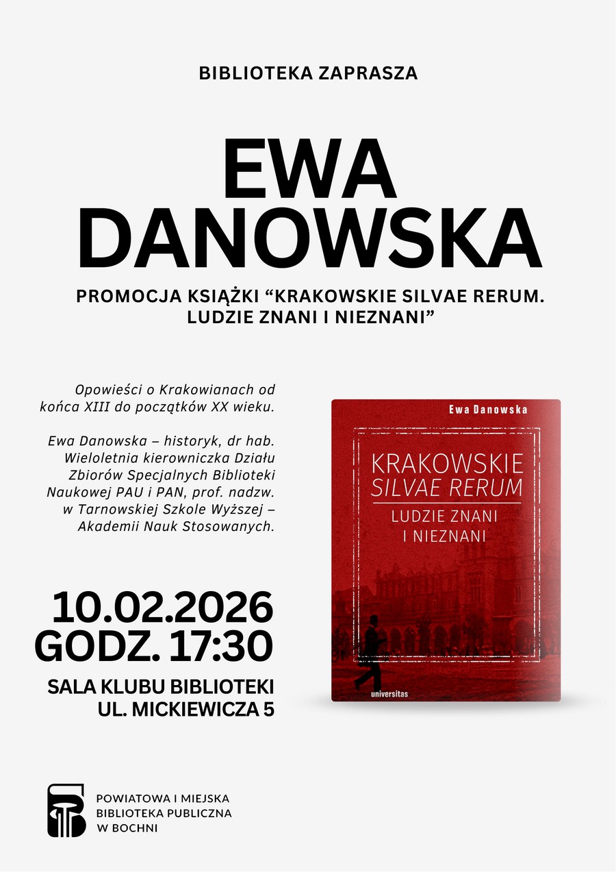 Powiatowa i Miejska Biblioteka Publiczna w Bochni zaprasza we wtorek 10 lutego o godz. 17:30 na spotkanie z Ewą Danowską i promocję najnowszej książki „Krakowskie silvae rerum. Ludzie znani i nieznani”.