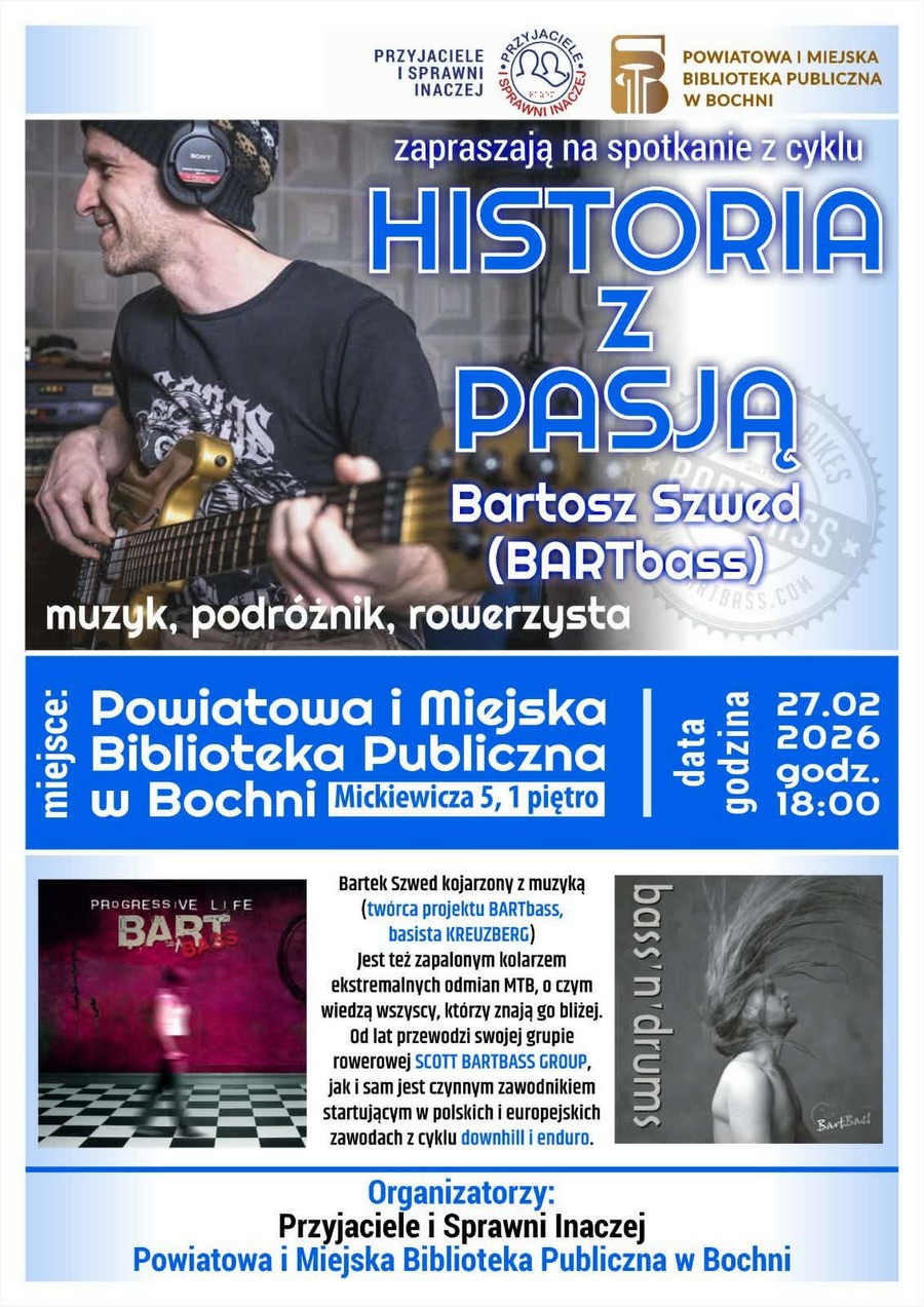 Przyjaciele i Sprawni Inaczej oraz Powiatowa i Miejska Biblioteka Publiczna w Bochni zapraszają w piątek 27 lutego o godz. 18:00 na spotkanie z cyklu „Historia z pasją”. Gościem będzie Bartosz Szwed (BARTbass) muzyk, podróżnik i rowerzysta.