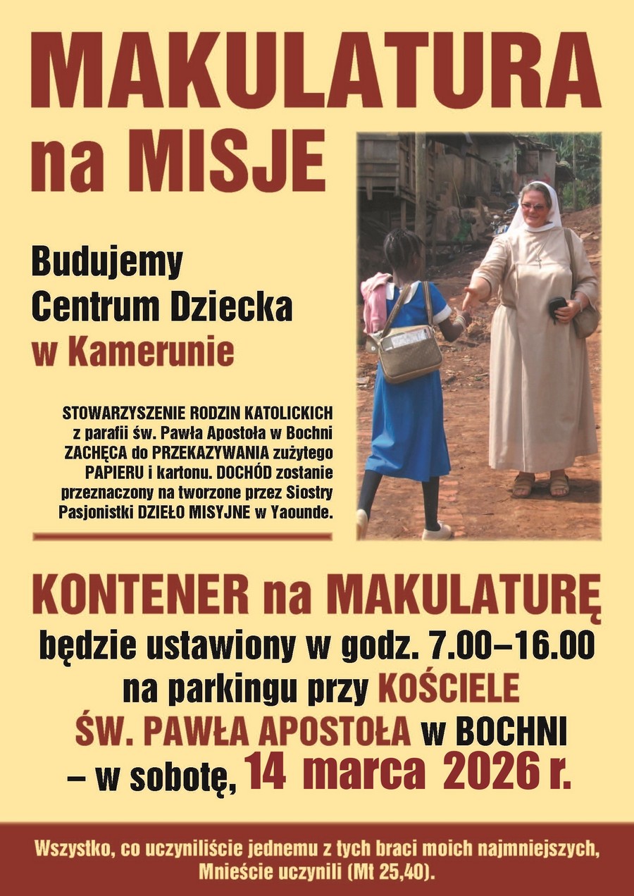 Stowarzyszenie Rodzin Katolickich przy parafii św. Pawła Apostoła w Bochni rozpoczyna 13. rok akcji „Makulatura na misje”. Pierwsza tegoroczna zbiórka odbędzie się w sobotę 14 marca przy kościele św. Pawła Ap. w Bochni.