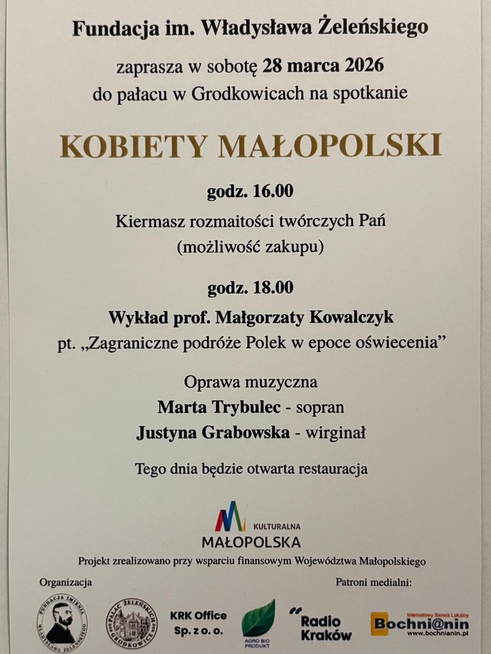 Kiermasz twórczości kobiet, wykład historyczny i koncert muzyki z XVIII i XIX wieku – tak zapowiada się spotkanie „Kobiety Małopolski”, które odbędzie się w sobotę 28 marca w Pałacu Żeleńskich w Grodkowicach. Wstęp na wydarzenie jest bezpłatny.
