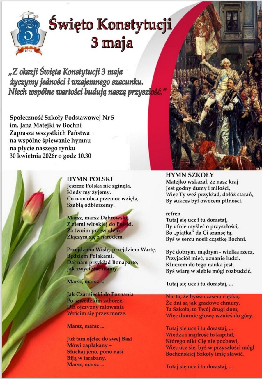 Wydarzenia Rynek w Bochni. W czwartek wspólne śpiewanie hymnu redakcja - 29 kwietnia 2026 | 10:15 FacebookX Szkoła Podstawowa nr 5 w Bochni zaprasza w czwartek 30 kwietnia o godz. 10:30 na Rynek w Bochni do wspólnego odśpiewania hymnu państwowego. Wydarzenie organizowane jest w związku ze zbliżającym się Świętem Konstytucji 3 Maja. TagiKonstytucja 3 MajaSzkoła Podstawowa Nr 5 FacebookX R e k l a m a PODOBNE ARTYKUŁY Uczeń SP nr 5 w Bochni laureatem ogólnopolskiego konkursu historycznego 11 czerwca 2025 | 11:43 Bochnia. Majówka w Parku Rodzinnym Uzbornia – ZDJĘCIA 5 maja 2025 | 11:15 Święto Konstytucji 3 Maja w Bochni – ZDJĘCIA 3 maja 2025 | 21:10 Please enable JavaScript to view the comments powered by Disqus. R e k l a m a NAJNOWSZE Duży sukces ucznia z Bochni. Stanisław Zięba z tytułem laureata ogólnopolskiego konkursu 29 kwietnia 2026 | 10:27 Rośnie bezrobocie w Małopolsce. Dane za marzec 2026 29 kwietnia 2026 | 10:13 Biblioteka w Bochni. Promocja XIX-wiecznych wznowień – ZDJĘCIA 29 kwietnia 2026 | 09:53 Streetball 3×3 ponownie na Rynku! Ruszyły zapisy zespołów 29 kwietnia 2026 | 09:20 🔸 Hulajnoga dla dziecka – jak mądrze wybrać sprzęt? 29 kwietnia 2026 | 09:18 4. liga piłki nożnej: Dziś mecz BKS – Glinik Gorlice 29 kwietnia 2026 | 08:51 Bochnia. Darmowe strzyżenie i solidarność z chorymi – akcja w „Mechaniku” 28 kwietnia 2026 | 20:22 R e k l a m a Artykuły promocyjne 🔸 Hulajnoga dla dziecka – jak mądrze wybrać sprzęt? 🔸 Konto demo – dlaczego to najlepszy poligon dla inwestora? 🔸 Wiosenne porządki od A do Z – co warto sprzątnąć i odświeżyć? Checklista Ogłoszenia 🔸 PRACA w STAL-CHEM: Pracownik ogólnobudowlany 🔸 PRACA w MAWI: Osoba zajmująca się sprawami kadr i płac 🔸 PRACA w COLD: Lakiernik proszkowy / Pomocnik lakiernika proszkowego 🔸 PRACA COLD Auto Centrum: Diagnosta samochodowy 🔸 PRACA w Segafredo – Magazynier / Operator 🚀 DOŁĄCZ DO WYTWÓRNI PIKSELI! SZUKAMY CONTENT MANAGERA Z ZAJAWKĄ! 🎯 Załaduj więcej CO? GDZIE? KIEDY? Bieżący miesiąc R e k l a m a R e k l a m a