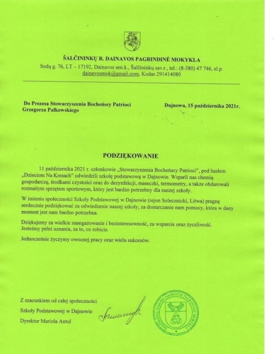 – Pragnę podziękować wszystkim którzy zaangażowali się w kolejną edycję „Dzieciom na Kresach”. Darów było bardzo dużo, szkoła w Dajnowie otrzymała chemię gospodarczą i środki czystości które powinny wystarczyć do końca roku szkolnego, a wiele rodzin potrzebujących dostało doraźne wsparcie. Będąc cały czas w kontakcie z rodakami nasze akcje mają charakter celowy, staramy się zawieźć to co jest najbardziej potrzebne, zarówno w szkole czy w danej rodzinie. Kolejna akcja już w grudniu – zapowiada Grzegorz Pałkowski, prezes Stowarzyszenia.