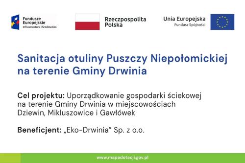 Oczyszczalnia Ścieków w Dziewinie oraz kanalizacja w miejscowościach: Dziewin, Mikluszowice, Gawłówek, powstały w ramach projektu nr POIŚ.02.03.00-00-0135/16 pn. „Sanitacja otuliny Puszczy Niepołomickiej na terenie gminy Drwinia” realizowanego ze środków POIiŚ 2014-2020.